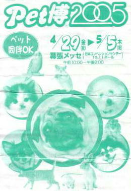 4月の29日に、‘ペット博2005(幕張メッセ)’を見学してきました。‘わんちゃん同伴OK’という事らしく、それはもう大騒ぎ…というほどの事もなく、何とも和やかな雰囲気の会場内ではありました。皆御自慢のペットを連れて、柵の中にも外にもわんちゃんな、落ち着く空間だったなぁ。個人的には今ハマっている‘黒パグ’の子供や大人が見れて、なかなか嬉しかったです。目が合った他人様の可愛ゆい‘黒パグ’ちゃんに、思いっきりラヴラヴ光線アイコンタクトしてあげました。先方のわんちゃんは、‘このひと誰だったかいな’という顔をしておりました。しかしもはや気分だけ‘ペット評論家’の私(何の知識もありません)といたしましては、あの‘ニシキヘビ’の子供と‘エリマキトカゲ’の行く末が…飼ってよいものわるいもの…ってあると思うんですけれど…。それから‘原田知世’様御結婚の報。以前、生‘知世’様と二度も目が合ってしまった私としては、御幸福をお祈り申し上げます、と言わざろう得ません。そうそう前回、「AVALON」も再見していたのに書き忘れました。何かこう‘センス’!という感じの作品です。‘ミューズの楽譜’という番組のゲストが、‘加古隆’様、‘本多俊之’様と続き私はたいへん嬉しいのですが、私好みのゲストだと、今時では‘視聴率’が取れるんでしょうか…。‘NHK様・人間ドキュメント〜北極熊ピース’とてもよかったです。それから‘珍妃の井戸’(‘浅田次郎’様)読了しました。すべては‘羅生門’か‘藪の中’か。ラスト近くの‘浅田節’が、やはりとてもよいでした。それから‘TV東京’さん、‘世界卓球選手権’を中継下さってどうもありがとうございました。それからもしかしたらしばらくは、‘黒澤明’監督様作品の中の数本を、続けて再見‘DVD’初見する事になるかもしれませんが、まずは「赤ひげ」〜たまにはこういうヒューマニズムな世界に、どっぷり浸かるのもよいものです。「天国と地獄」〜‘踊る大捜査線’に於ける煙突の煙は、この作品に対するオマージュであろうわけでして、どういう感想を持ってもそれは人それぞれなのですが、何十年前の作品かという事を意識しつつ、一度は観るべき一般常識な二作品ですよねぇ。 P.S.やっぱり鯨は一度生で見たいですが、そのひとの感受性に由っては‘人生観’が変わってしまうのである意味危険である、とかいう文章をずっと昔に読んだ記憶があるのですが、この際‘東京湾’を人工池州として、2〜3頭飼育していただけると、非常に助かるという気がいたしました。